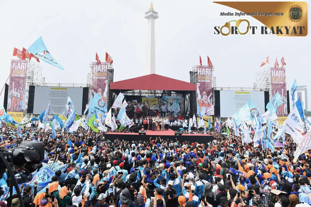 Sorotrakyat.com | Jakarta – Monumen Nasional (Monas) pada Kamis, 1 Mei 2025, berubah menjadi lautan merah dan putih, bukan bendera, tapi jaket dan spanduk 200.000 lebih buruh yang memadati kawasan ikonik Jakarta itu. Presiden Prabowo Subianto, bak pahlawan yang dinanti, hadir langsung di tengah-tengah perayaan Hari Buruh Internasional, membawa “kado” yang membuat para pekerja bersorak gembira.