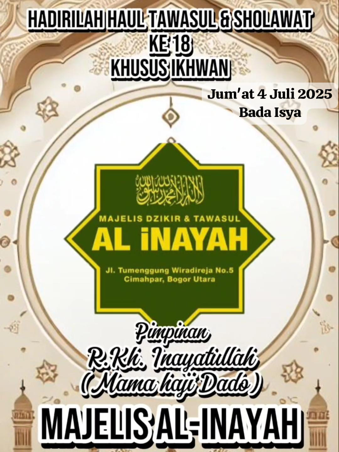 Acara ini sengaja dipersembahkan khusus untuk para ikhwan (laki-laki), sebagai sarana untuk mempererat tali persaudaraan dan meningkatkan kualitas spiritual secara mendalam. Panitia mengimbau seluruh jamaah untuk datang tepat waktu dan bersama-sama menciptakan suasana yang khusyuk dan tertib. Jangan lewatkan kesempatan langka ini untuk merasakan langsung pancaran keberkahan dari Majelis Al-Inayah dan bimbingan spiritual dari Mama H. Dado!