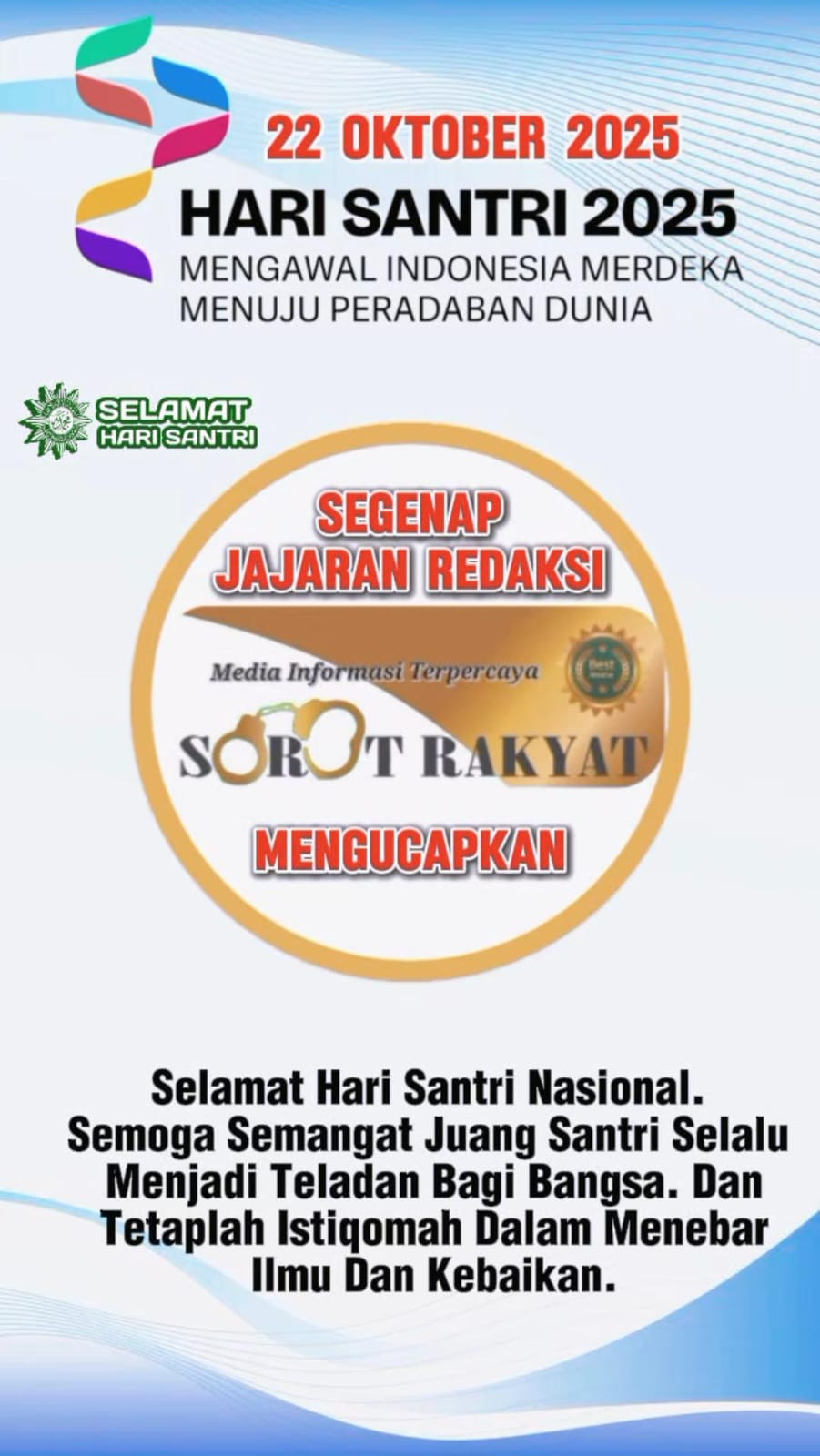 Menyambut Hari Santri Nasional 2025, Pemimpin Redaksi Sorotrakyat.com, Deni Rachman atau yang akrab disapa Kang Deni, beserta segenap jajaran Redaksi media Sorotrakyat.com, menyampaikan ucapan selamat dan apresiasi setinggi-tingginya kepada seluruh santri di penjuru negeri.