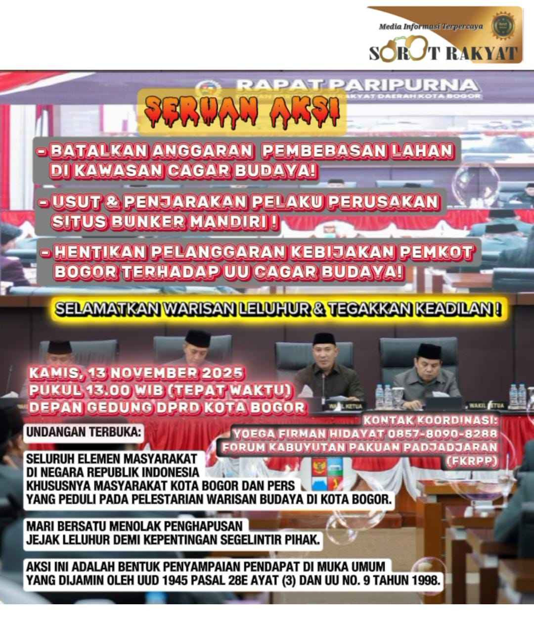 Sorotrakyat.com | Kota Bogor — Rencana Pemerintah Kota (Pemkot) Bogor mengalokasikan anggaran untuk pembebasan lahan di kawasan yang diduga merupakan Situs Cagar Budaya, diperparah dengan dugaan perusakan Situs Bunker Mandiri, telah memicu badai perlawanan yang sangat keras. Forum Kabuyutan Pakwan Padjadjaran (FKPP) bersama 110 organisasi masyarakat (ormas) dan perwakilan kesultanan se-Nusantara, bersiap melancarkan aksi besar dan menempuh jalur hukum.