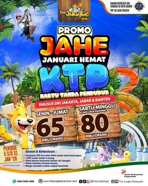Dengan berbagai wahana menarik mulai dari seluncuran yang memacu adrenalin hingga area bermain ramah anak, The Jungle Bogor tetap menjadi pilihan utama wisata air di Kota Hujan. Pastikan Anda membawa KTP dan mengajak keluarga atau sahabat untuk merasakan keseruan “Januari Hemat” ini sebelum periode berakhir pada 31 Januari mendatang. (FY)