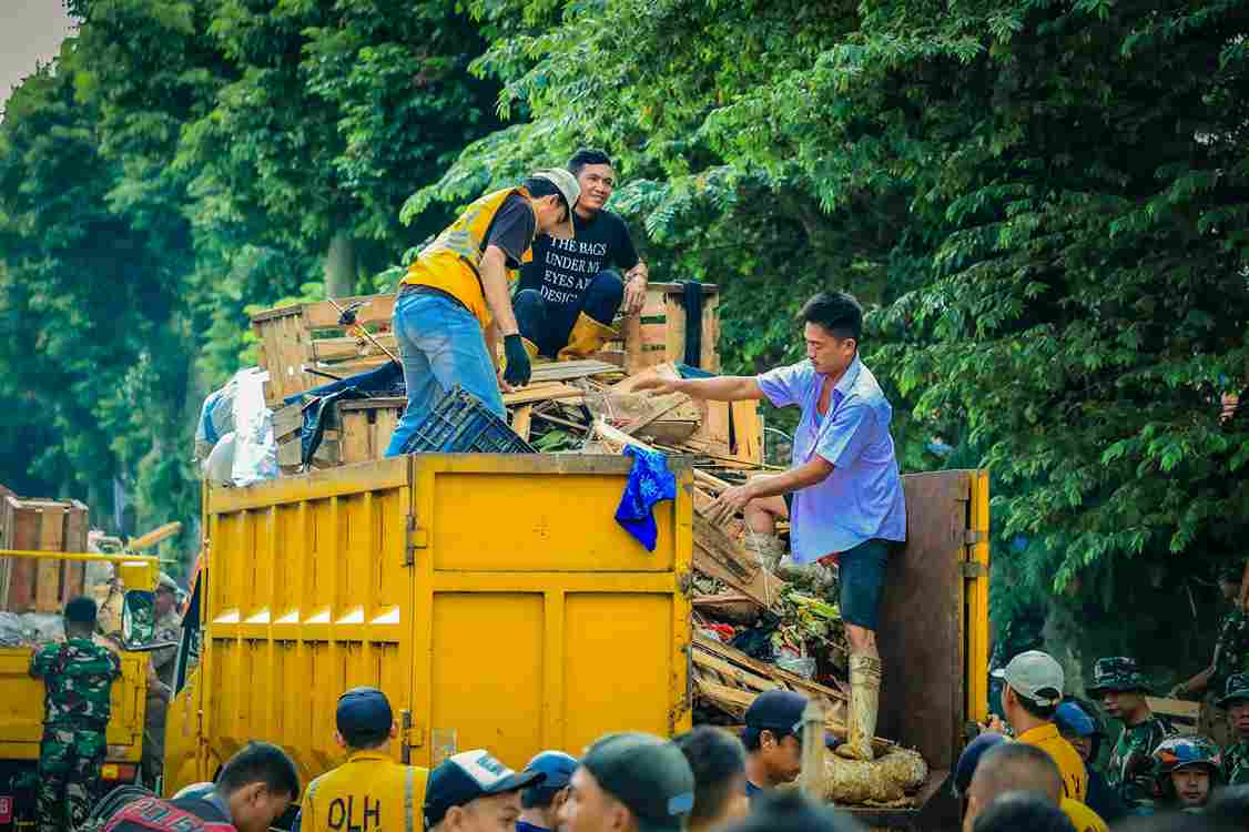 Petugas gabungan dan masyarakat bahu-membahu menaikkan tumpukan sampah kayu dan palet bekas lapak PKL ke atas truk sampah DLH dalam aksi Jumsih besar-besaran.