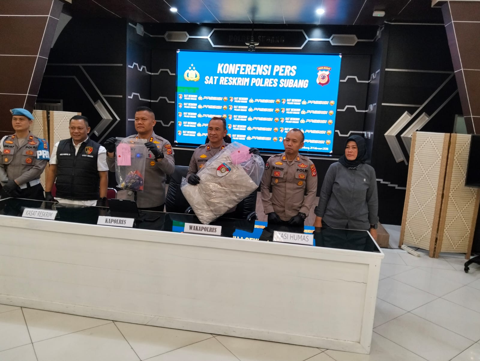 Kapolres Subang AKBP Dony Eko Wicaksono didampingi Waka Polres Subang Kompol Asep Agustoni, Kasat Reskrim, Kasi Humas, dan Kasi Propam memaparkan secara langsung konstruksi perkara yang ditangani Satuan Reserse Kriminal tersebut.
