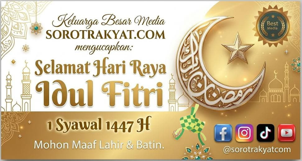 Keluarga Besar Media SorotRakyat.com mengucapkan: Selamat Hari Raya Idul Fitri 1 Syawal 1447 H. Taqabbalallahu Minna Wa Minkum, Shiyamana Wa Shiyamakum. Mohon Maaf Lahir & Batin.
